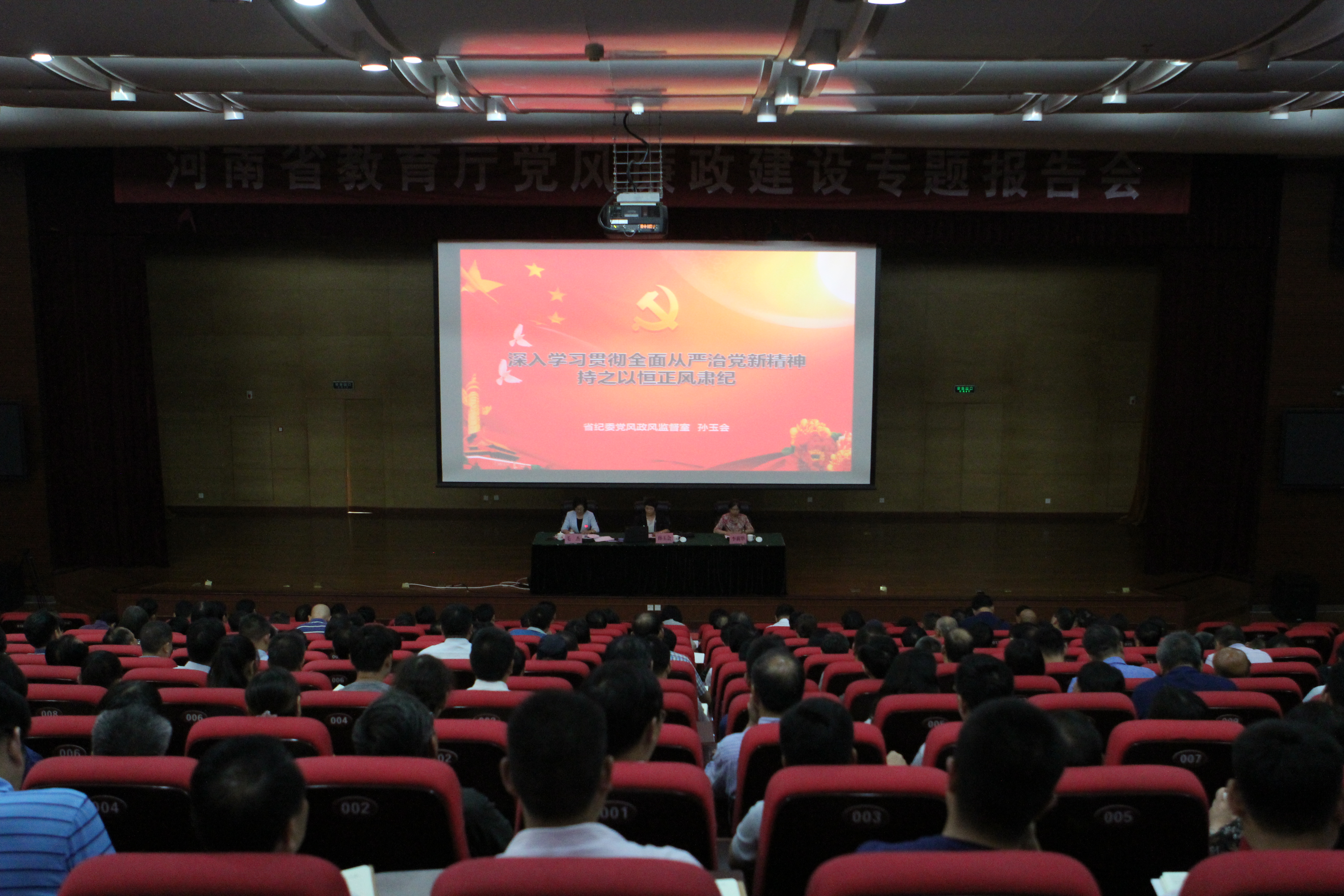 主题党日活动由毛杰主持,内容主要有三项,一是毛杰副厅长传达学习省高校工委、省教育厅党组新出台的《贯彻落实中央八项规定实施细则精神的办法》;二是李莉华书记通报教育系统2017年以来案件情况;三是特邀河南省纪委党风政风监督室主任孙玉会作题为《深入学习贯彻全面从严治党新精神,持之以恒正风肃纪》辅导报告。